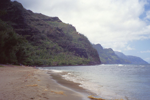 Likewise, I took two similar photos from the beach at Ke'e, looking west toward the Na Pali cliffs--they differ mostly in the views of the beachgoers in or near the water:
