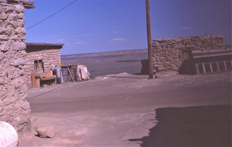 At the heart of the Hopi Reservation are three mesas topped with villages, one of which, Old Oraibi on Third Mesa, dates back to at least 1100. The mesas are not as high or inaccessible as the one for Acoma Pueblo. We were allowed to walk around the villages but not to take photos of people. Here are two pictures of one of the villages, followed by distant shots of (if I recall correctly) Old Oraibi, which is built onto a peninsula jutting out from Third Mesa.