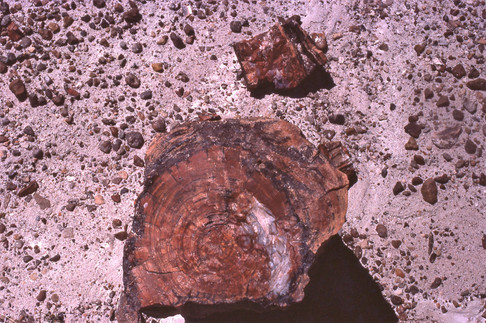 Look carefully at this photo and you'll see a person walking along a path. Look even closer and you'll see what could be a scattering of short logs in his vicinity. It's not exactly a forest, but there was one here once upon a time. We are in the Petrified Forest, the national park just over the border into Arizona from Gallup, New Mexico, where Max and I had spent the previous night. (See previous post on the powwow we attended there.)