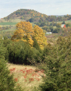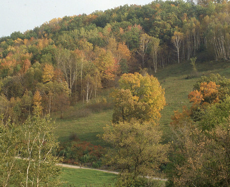 These photos were taken out in "the Kettles," i.e., in the Kettle Moraine State Forest west of Sheboygan, where I had taken pictures back in '76 (BOXES 103-105). Below you see Debbie and David (left and right foreground) and the French visitors coming down from the Parnell Esker (glacial gravel ridge) and then a couple of photos of a kame (gravel mound):
