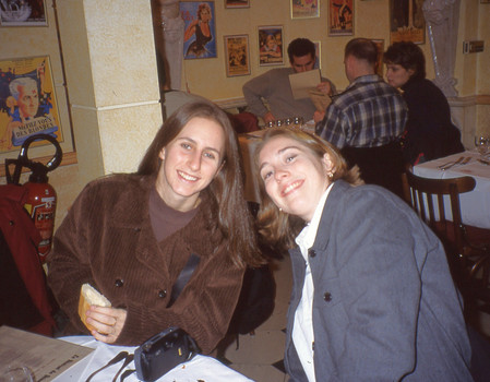 I reported in my previous post on how this trip came about and what we did during our first days in Canterbury. Anne and I had no official responsibilities during this faculty-led trip, whose itinerary included one or two free days. We had brought Becky and Michelle with us for their first European visit (Aron had gone with Anne to Amsterdam some years earlier), and for one of our free days we discovered an opportunity to take them to Paris. A Thomas Cook travel agency down the street from our hotel was advertising a bargain day-trip that even included lunch at a Parisian restaurant along with the round-trip fare. Canterbury is only a short train ride from Ashford, the one stop in England made by the super-express Eurostar before plunging beneath the English Channel on its way to Paris. (Service from Ashford had begun only two years previously.) Several students asked if they could join us, and so one morning we all caught the local train to Ashford and enjoyed the Eurostar experience, arriving at Paris's Gare du Nord about midday.