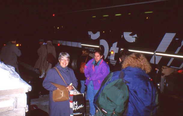 I have lots of other good memories of the trip, such as seeing a holiday-season pantomime at the Marlowe Theatre in Canterbury, but no photos to go with them. My last shots of the trip, taken doubtless to finish up the slide roll, are from back in Sheboygan, one of Jean and others as they unloaded the bus, and one of Chris and Jim from inside a campus building while awaiting rides home.