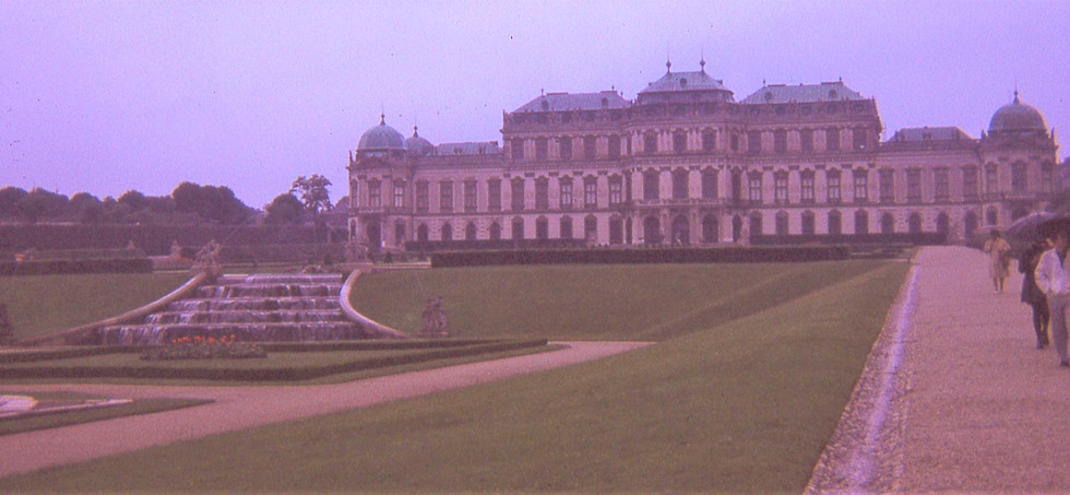 These are all the photos I took of Vienna, other than a couple that are too dim to be worth reprinting, thanks to the Instamatic's inability to handle rainy weather. I was glad to have visited the city, but overall I had been much more impressed by Prague. Maybe it was the grey weather, or the fact that we didn't see any musical performances. The highlight for me was visiting the Belvedere, for its Klimts and the views of the city spread out in the distance. To be sure, the Kunsthistorisches Museum was exciting to visit for its painting collection--many Bruegels among the Hapsburg Emperors' legendary collection. And the famous cafes and pastry shops were memorable, and I enjoyed having a Sachertorte at the Hotel Sacher. I got to visit Vienna a second time in 1989, and had the same mild overall impression--but on a third visit, in 2012, I really came to love Vienna. There were several reasons for this change of heart: getting to see a concert at the famed Musikverein and an opera at the Staatsoper; going on a self-guided walking tour of locations for one of my favorite movies, The Third Man; seeing the stunning baroque interior of the National Library, which in 1972 I didn't know existed; and enjoying a first-rate bus-and-walking tour of the city with an excellent guide. (This was part of our campus trip abroad to Germany, Austria and the Czech Republic.)