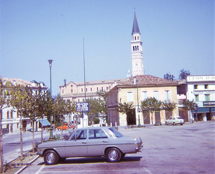 Since I didn't know how to drive stick in those days, we were forced to rent a Mercedes, the only car in the rental lot equipped with automatic. I didn't mind that either, though it was a relatively modest model, yet still pricier than a stick rental. As you can see from the windshield shot below, the scenery as we drove through the Veneto was spectacular.